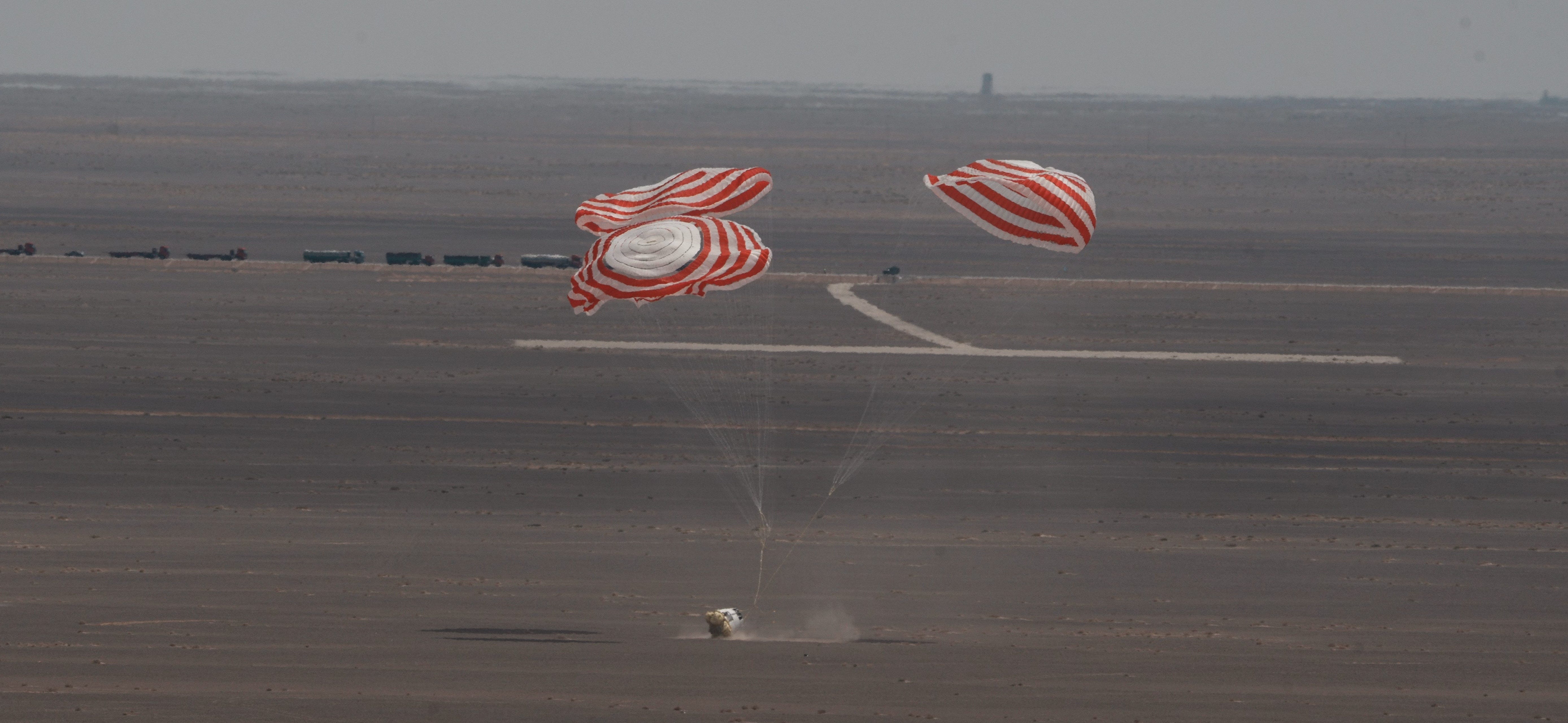 Two minutes after the Mengzhou blasted off, the capsule touched down in Jiuquan’s surrounding desert, cushioned by airbags underneath the capsule. The three main parachutes floated down shortly after, after which recovery teams approached to retrieve the capsule.