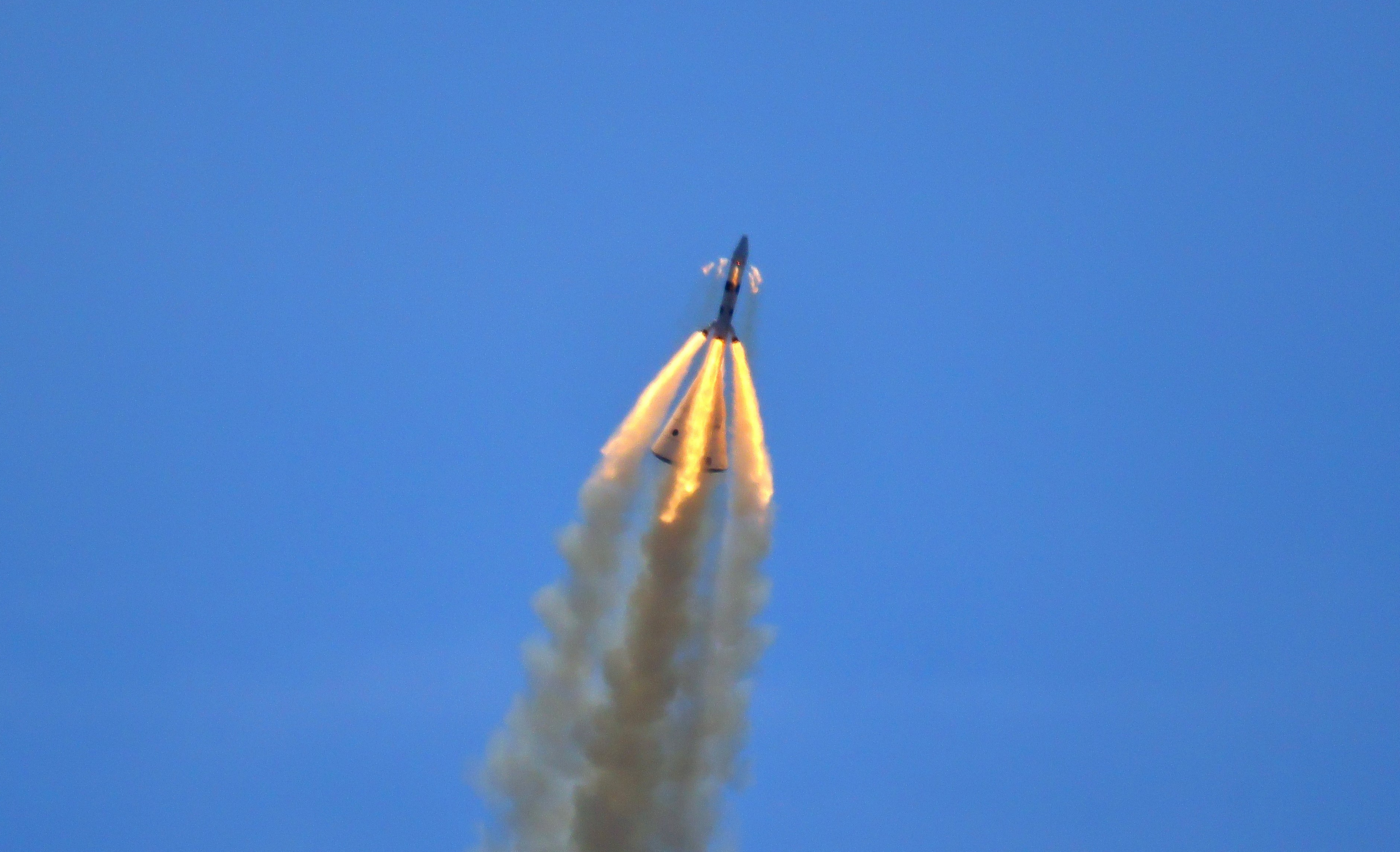 Now free of the escape system, the Mengzhou capsule rocked toward a stable descent angle before deploying two drogue parachutes to slow it enough to release the three large main parachutes. The three main parachutes deployed successfully to slow Mengzhou’s descent to a crawl relative to the ascent. During the slow descent, the capsule’s heat shield was also released, allowing airbags to inflate.