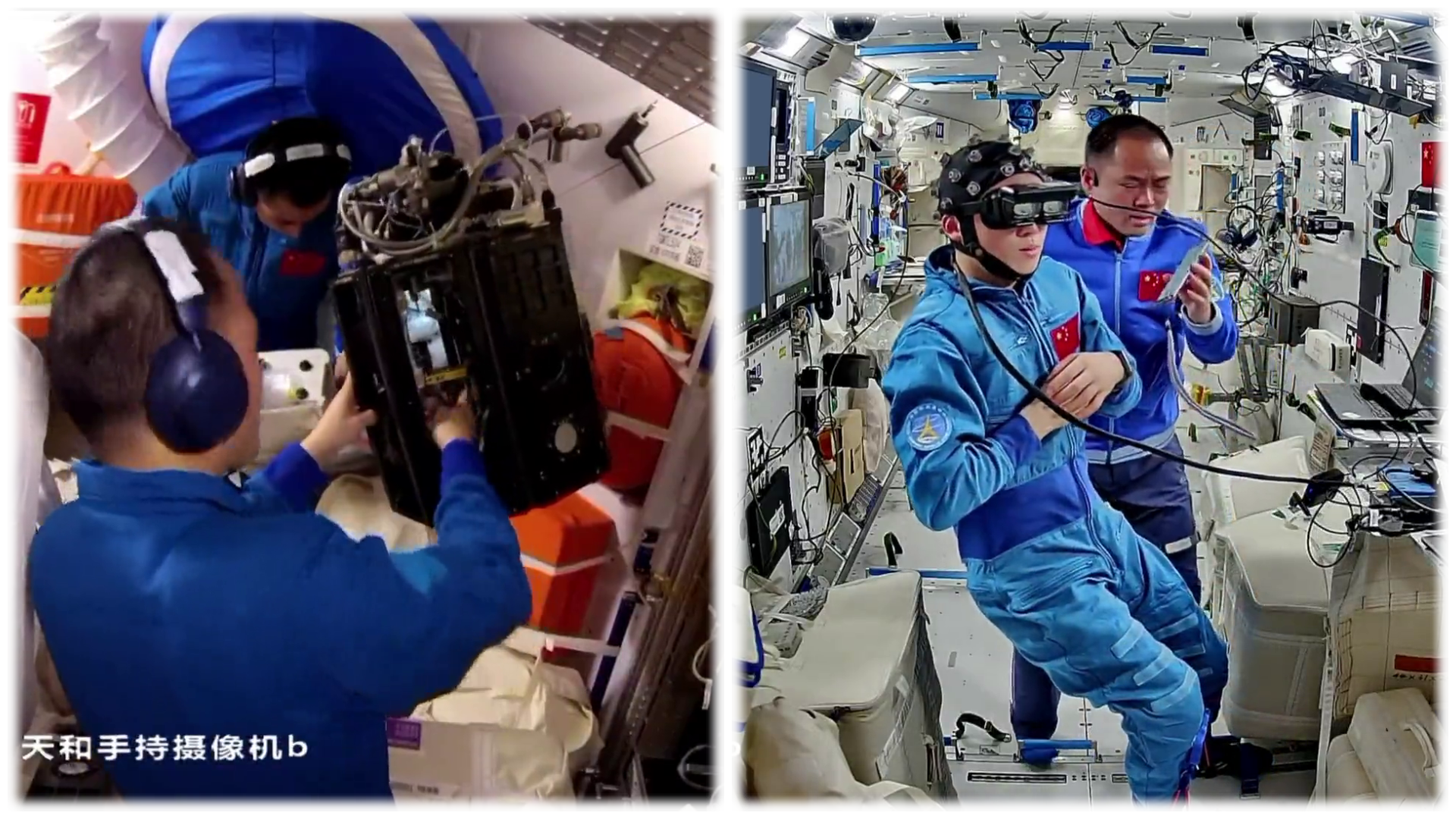 In the field of space medicine experiments, the crew conducted related studies using brain-computer interface equipment. In the footage, taikonauts wearing glasses completed multiple experiments, including brain-face coordination tasks. This research aims to explore the characteristic patterns and trends of taikonauts' brain-controlled signals under weightless conditions. Simultaneously, studies were conducted on critical gravity perception, physical force perception, and spatial memory and regulation.