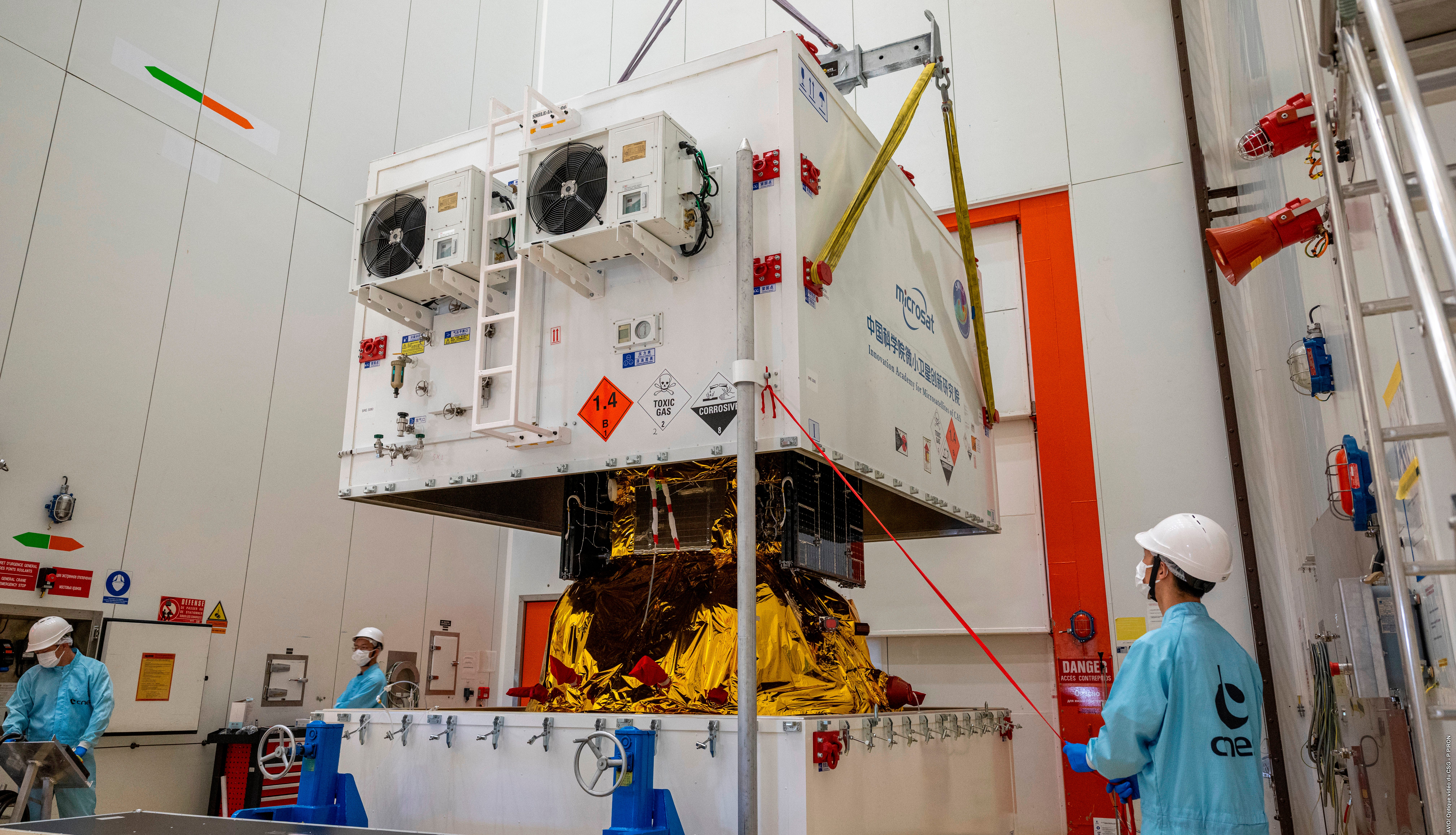 Not long after arrival, the satellite, still in its climate-controlled transportation container, was whisked away to a cleanroom a few kilometers away at the Guiana Space Centre for pre-launch processing and final tests. A few days after the European Space Agency’s press release, the Innovation Academy for Microsatellites, Chinese Academy of Sciences (中国科学院微小卫星创新研究院) shared that SMILE was healthy at the space centre following delivery.